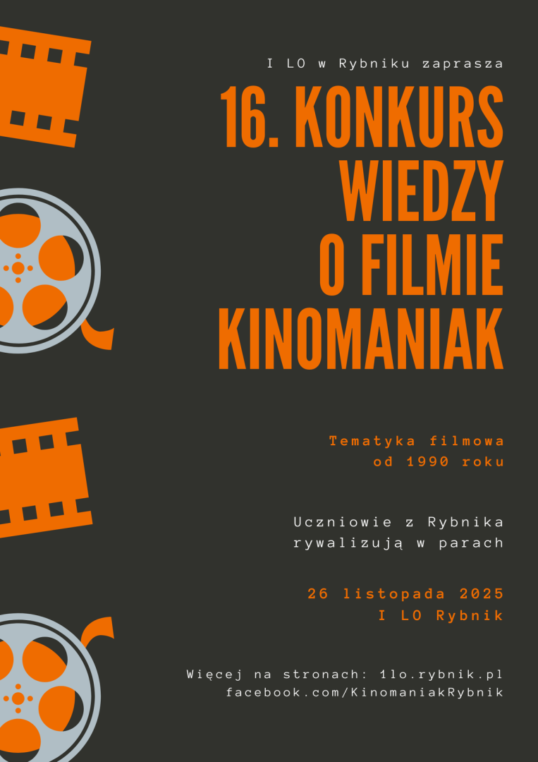 Konkurs jest przeznaczony dla uczniów rybnickich szkół ponadpodstawowych, którzy rywalizują w parach. Na zgłoszenia 2-osobowych zespołów wraz z opiekunem czekamy do poniedziałku 24 listopada 2025 roku pod adresem kinomaniak@1lo.rybnik.pl. W treści zgłoszenia prosimy podać imiona i nazwiska członków 2-osobowych zespołów, nazwę szkoły, do której uczęszczają, a także imię i nazwisko nauczyciela – opiekuna. Każda szkoła może zgłosić maksymalnie 4 drużyny*.