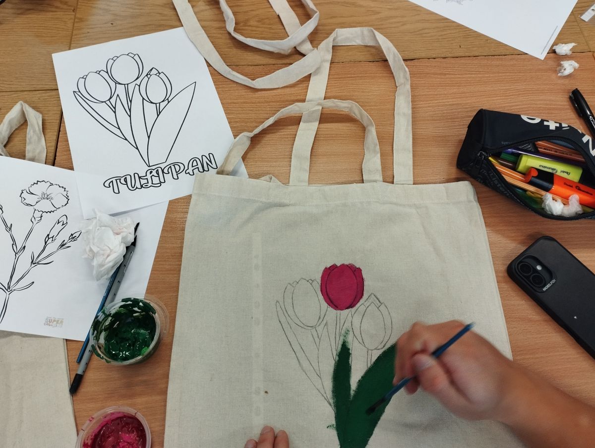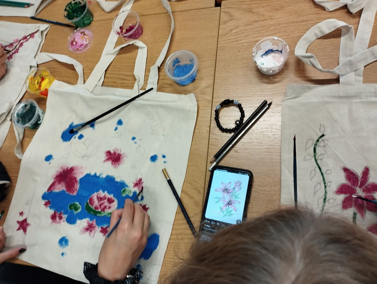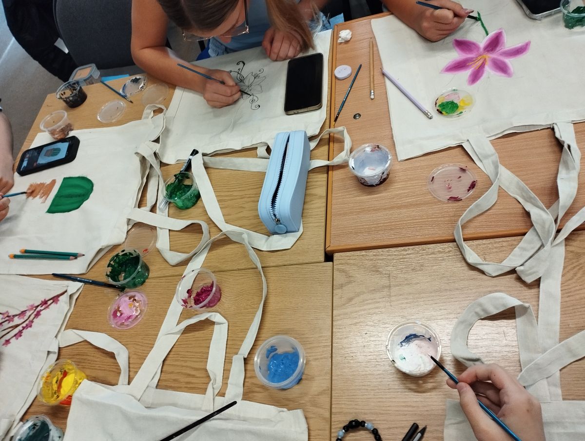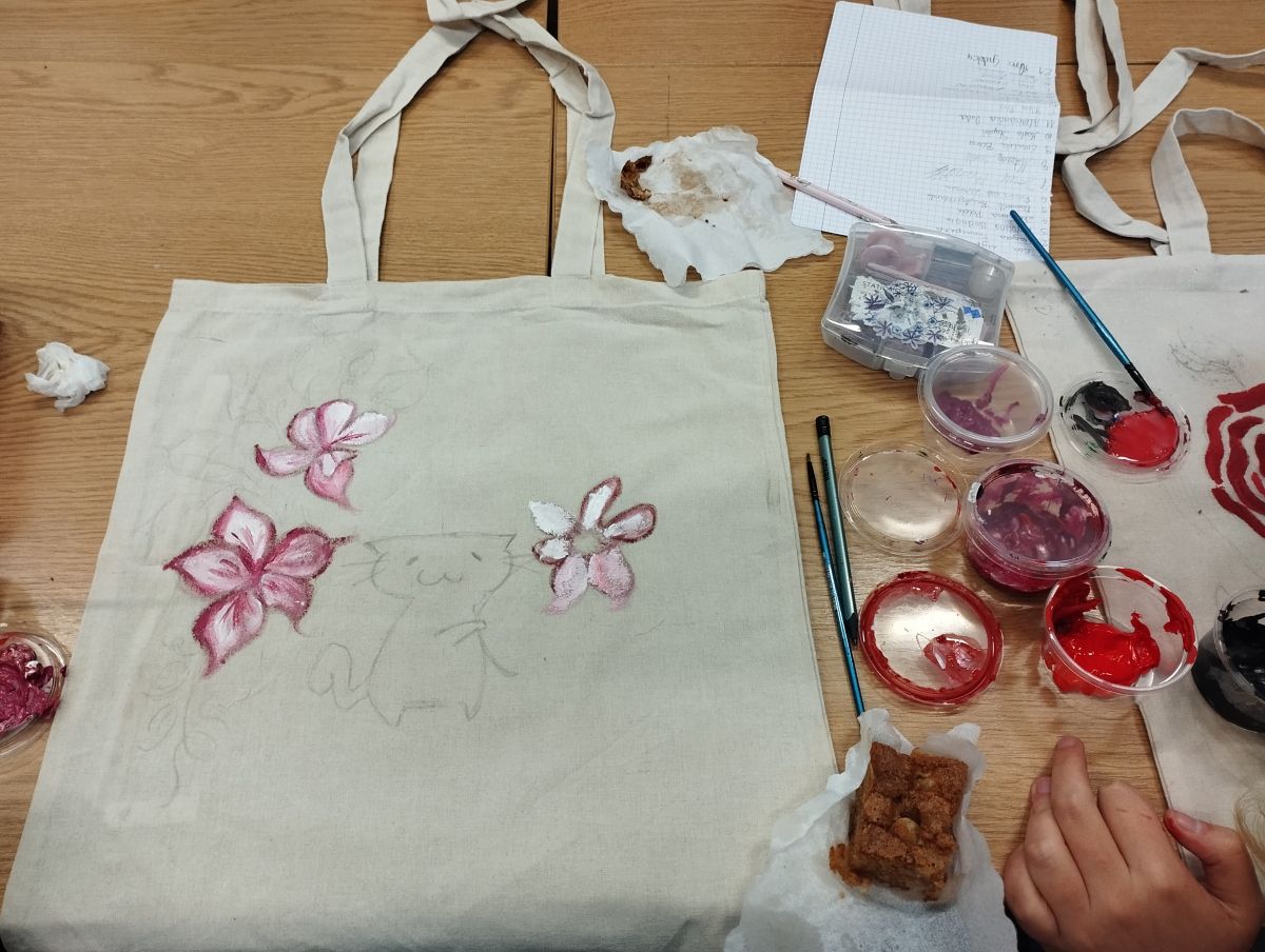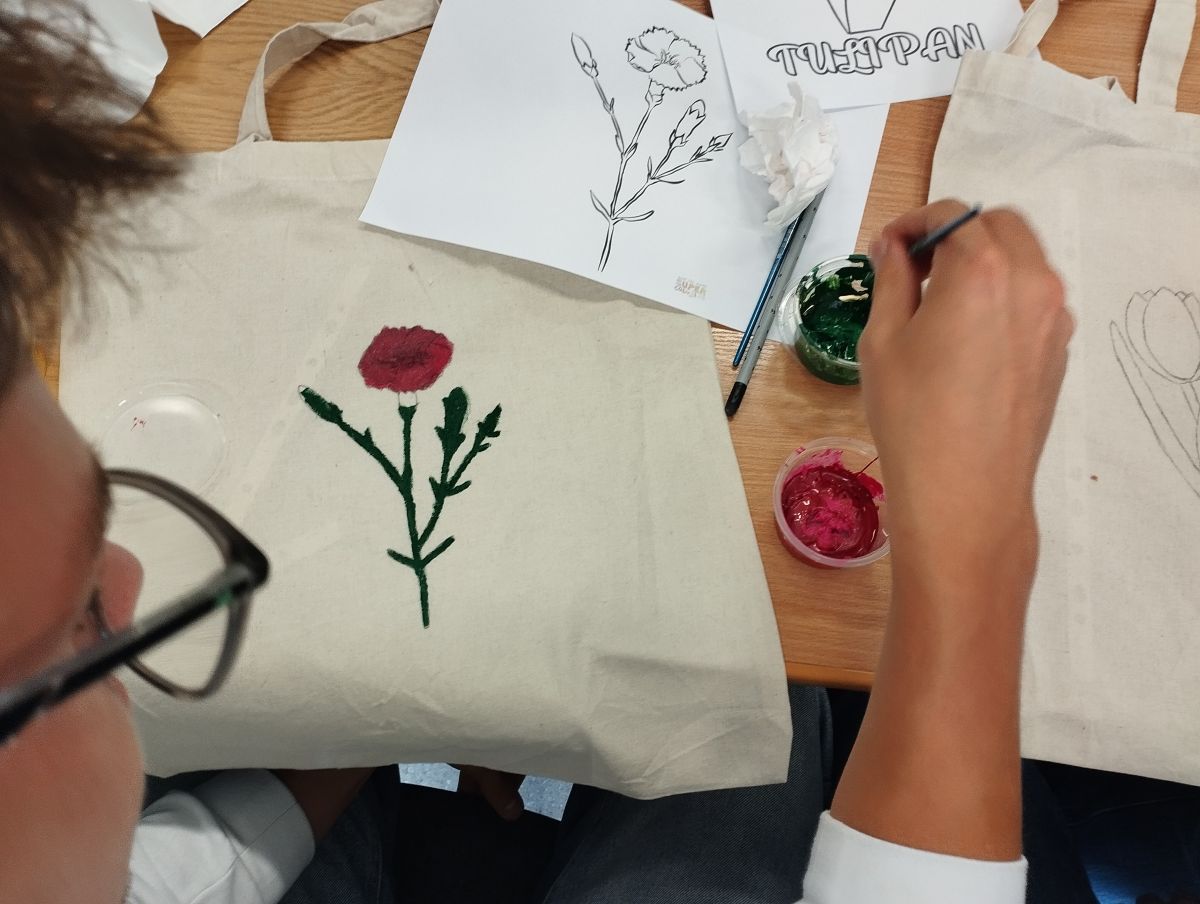 Następnie odbyły się warsztaty, podczas których uczniowie malowali ekologiczne torby, promując w ten sposób ideę ograniczania plastiku i dbania o środowisko naturalne. Uczniowie wykazali się ogromną kreatywnością, a ich prace zachwycały kolorami i pomysłowością.