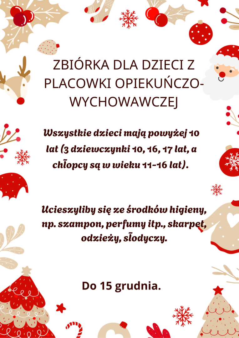 Samorząd Uczniowski zaprasza całą społeczność szkolną do udziału w świątecznej akcji na rzecz dzieci z Placówki Opiekuńczo-Wychowawczej. To wspaniała okazja, by podarować innym coś od serca i wywołać uśmiech na twarzach młodych ludzi, którzy szczególnie potrzebują wsparcia.